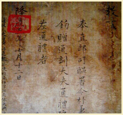 ¹Úº´±Õ(ÚÓܼз) ±³Áö : ºÀÁ÷¶û(ÜåòÁÕÍ) »ç¿Â¼·É Áõ(ñü) ÅëÈÆ´ëºÎ(÷×ýºÓÞÜý) Å뿹¿ø(÷×çßêÂ) ÁÂÅ뿹(ñ§÷×çß) À¶°æ(ëØÌÔ) 5(1571)³â 7¿ù 12ÀÏ. | |