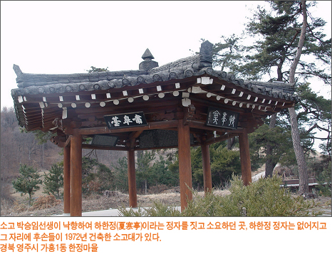 ÀÌ Á¤ÀÚ´Â °íÀå ¼±ºñ »ï¶ô ¹ÚÁ¾¹« ¼±»ýÀ» Ã߸ðÇÏ¿© Áö³ ¹«Àγâ(1938³â)¿¡ ±× ÈļյéÀÌ ¼¼¿ü´Ù. ±×·±µ¥ ÀÌ Á¤ÀÚ°¡ ÇÏÇÑÁ¤À¸·Î À߸ø ¾Ë·ÁÁø °ÍÀº ´ë·« ´ÙÀ½°ú °°Àº »ç¿¬À¸·Î ÇØ¼¿´´Ù. ÀÏÂï ¼Ò°í¼±»ý²²¼ µÞ»õ(µÎ¼)¿¡ °è½Ã´Ù°¡ ¾Æ¸§´Ù¿î dz±¤°ú Á¶¿ëÇÏ°í ±ú²ýÇÔÀ» ÃëÇÏ¿© ¸¸³â¿¡ ¿©±â Ãʰ ¿Å°Ü ÅÍÀüÀ» ¿°í ±× ¾Æµå´Ô Ãë¼ö°ø(öâ²Íë)À» ½ÃÄÑ Áö±Ý ¼Ò°í´ë ÀÚ¸®¿¡ Á¤ÀÚ¸¦ Áþ°í ÇÏÇÑÁ¤(ù¾ùÎïÍ)À̶ó À̸§Çϼ̴µ¥ ¿©·¯ ÇØ µÚ¿¡ ±× Á¤ÀÚ¸¦ Á¾Åà ¿·¿¡ ¿Å°Ü ¼¼¿ü´õ´Ï ¿À·£ ¼¼¿ù¿¡ Á¤ÀÚ´Â ¾ø¾îÁö°í ±× ÇöÆÇ°ú ±â¹®¸¸ÀÌ ³²¾Æ¿À´ø ¹Ù ±× ÇöÆÇ°ú ±â¹®À» ÀÌ Á¤ÀÚ(ß²Õ¥ÓÑ)¿¡ °É°Ô µÊÀ¸·Î ÇÏ¿© ±×·Î½á ÇÏÇÑÁ¤(ù¾ùÎïÍ)À¸·Î ¾Ë·ÁÁö°Ô µÇ¾ú´ø °ÍÀÌ´Ù. ÀÌ Á¤ÀÚ(ù¾ùÎïÍ)´Â ÀÌ·èµÈÁö 50³â ¹Ù¶÷ ºñ¿¡ ¸Å¿ì Åð¶ôÇØÀú¼ Áö³ ¿©¸§(1988³â 7¿ù) ¿©·¯ ÀÚ¼ÕµéÀÌ ¼º·ÂÀ» ¸ð¾Æ º¸¼öÀÇ °á»ç¸¦ ÀÏÀ¸ÄÑ ±âµÕÀ» ¹Ù·ÎÀâ°í ÁöºØÀ» |