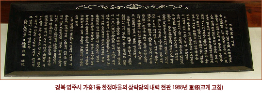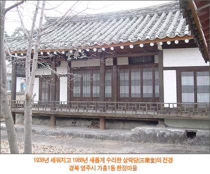 »ï¶ô´ç(ß²Õ¥ÓÑ)Àº 1938³â ¼Ò°í ¹Ú½ÂÀÓ(ÚÓã¯ìò 11¼¼)¼±»ýÀÇ ¼ÕÀÚÀÌÀÚ ³ìÀÇ ¾ÆµéÀÎ ¹ÚÁ¾¹«(ÚÓðôÙò)¼±Á¶ÀÇ À¯´öÀ» Ã߸ðÇϰíÀÚ ÈÄÇеéÀÌ ¼¼¿î °ÇÃ๰ÀÔ´Ï´Ù. »ï¶ô´ç ÀÚ¼(í»ßö)¿¡¼ ¡° ¼±(à¼)À» ÇàÇÏ´Â °ÍÀÌ °¡Àå Áñ°Å¿î ÀÏÀ̶õ ¶æÀ¸·Î °ÅóÇÏ´Â ¹æÀ» ÃÖ¶ô¿Í(õÌÕ¥èÀ)¶ó Çß°í, µ¶¼(Ôºßö)¸¸ÇÑ Áñ°Å¿òÀÌ ¾ø´Ù´Â ¶æÀ¸·Î ¼Àç(ßöî±)¸¦ Áö¶ôÀç(ò¸Õ¥î±)¶ó ÇßÀ¸¸ç, ¸¸Á·(Ø»ðë)ÇÔÀ» ¾Ë¸é ºóõ(Þ¸ôÁ)ÇØµµ Áñ°Ì´Ù´Â ¶æÀ¸·Î °ÅóÇÏ´Â ´ëûÀ» ¿ª¶ôÇå(æ²Õ¥úÍ)À̶ó ÇÏ¿© ÅëÆ²¾î »ï¶ô(ß²Õ¥)À̶ó À̸§Çϳë¶ó ¡± Çß½À´Ï´Ù. »ï¶ô´çÀ̶õ ´çÈ£´Â ¹Ù·Î ÀÌ·¯ÇÑ Á¤½ÅÀû ¹è°æ¿¡¼ ž½À´Ï´Ù. ÞÍ×ù(º½½ÇÏÁö ¾Ê°í ¹°·¯³ª Çй®¿¡ Èû¾²´Â ¼±ºñ)À¸·Î¼ ÀÚ½ÅÀÌ °ÅóÇÏ´Â ÁýÀÇ °¢°¢ÀÇ À̸§À» Áþ´Âµ¥µµ ÇÐÀÚ´Ù¿î °¢¿À¸¦ ¹àÇô¼ ÇöÆÇÀ» °É°í, È寮·¯ÁöÁö ¾Ê±â¸¦ ´ÙÁüÇß´ø Á¤½ÅÀ» º¼ ¼ö ÀÖ½À´Ï´Ù. |